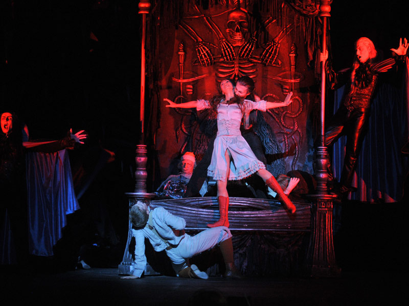 Famous production, a real hit in musical world, musical “Tanz der Vampire” for the first time in Russia was produced on the stage of our theatre. One of the most profound film directors Roman Polanski made movie for the popular at those time theme about vampires. Director has created especially beautiful film in which lyricism, mystery and disquieting presentiments are adjoined by humor. Movie of Polanski was such a success that idea to create musical based on its material arose. This intention was realized by famous composer, co-author of Andrew Lloyd Webber, Jim Steinman and author of librettos Michael Kunze. On 4th of October 1997 opening night of “Tanz der Vampire” took place in Viennese theatre “Raimund”, it was such a success that theatres of various countries became interested in the show. 12 years later Cornelius Baltus realized direction of new version “Tanz der Vampire”, opening of new version took place on 17th of September 2009 on the stage of “Ronacher” theatre. Nowadays “Tanz der Vampire” is staged in 10 cities of Europe. Professor Abronsius and his young assistant Alfred are trying in vain to safe people of Transylvanian small village from vampire, mysterious count von Krolock, and his huge retinue. Demonic attraction of count casts a spell over people and they taking the risk to yield to temptation turn into vampires. Based on Turner Entertainment Co.’s motion picture ‘The Fearless Vampire Killers’, produced with the kind permission of Warner Bros. Theatre Ventures Inc. The performance is recommended for viewers aged 18 and above